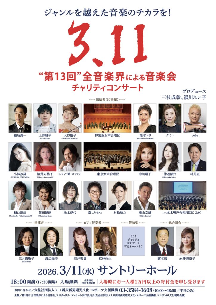 3/11(水) 第13回「全音楽界による音楽会」 3.11チャリティコンサート